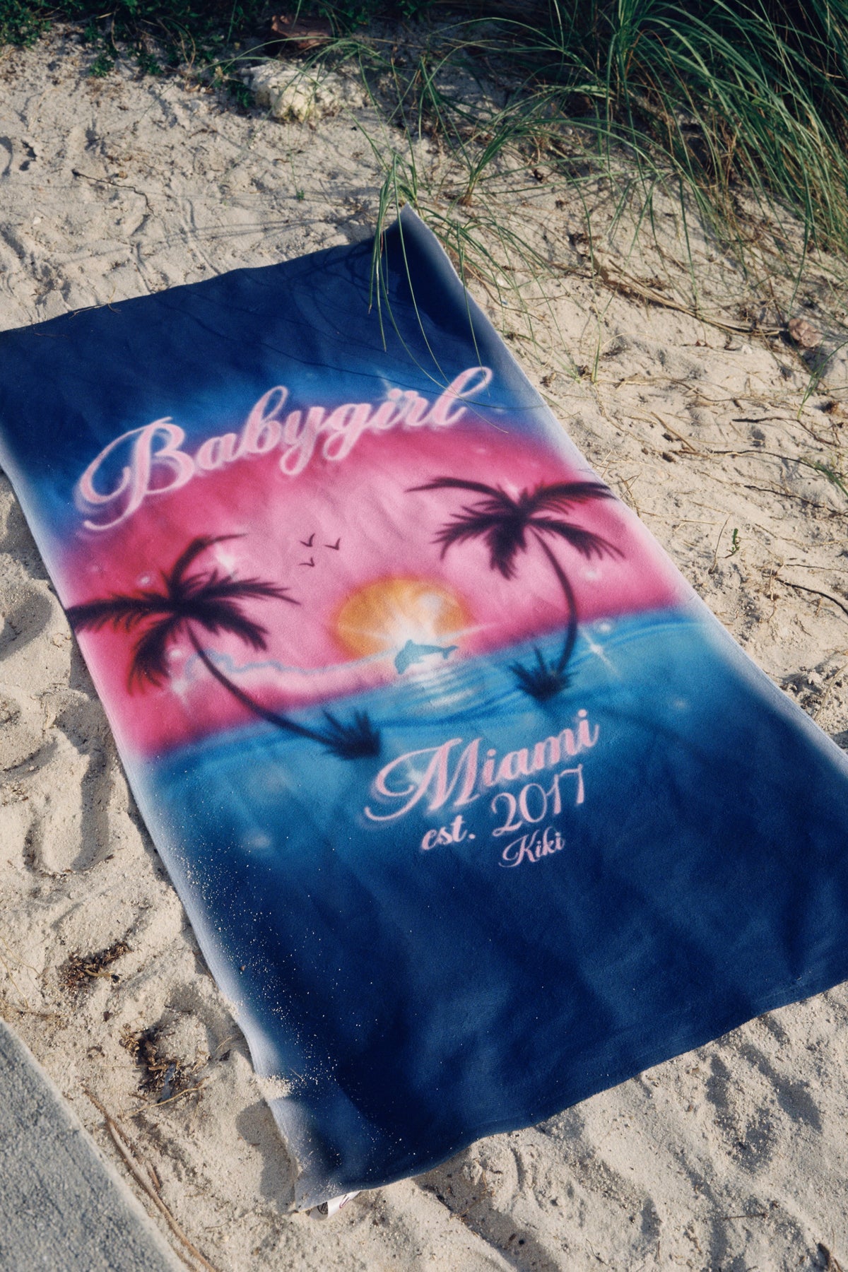 Get a little taste of Miami from our custom towel. This is for all the babygirls to take on their beach days, made to withstand the sun and keep you dry!  Our first of many collectors items!