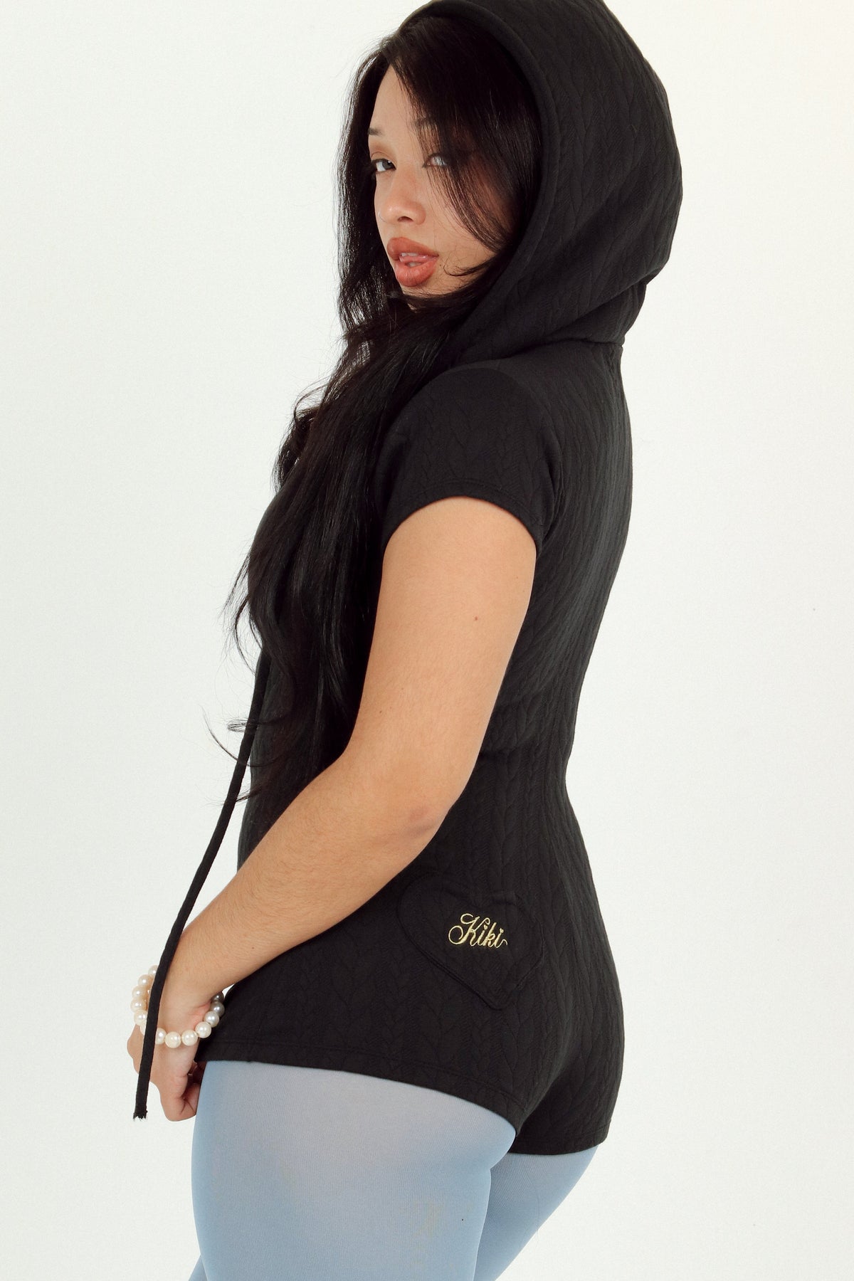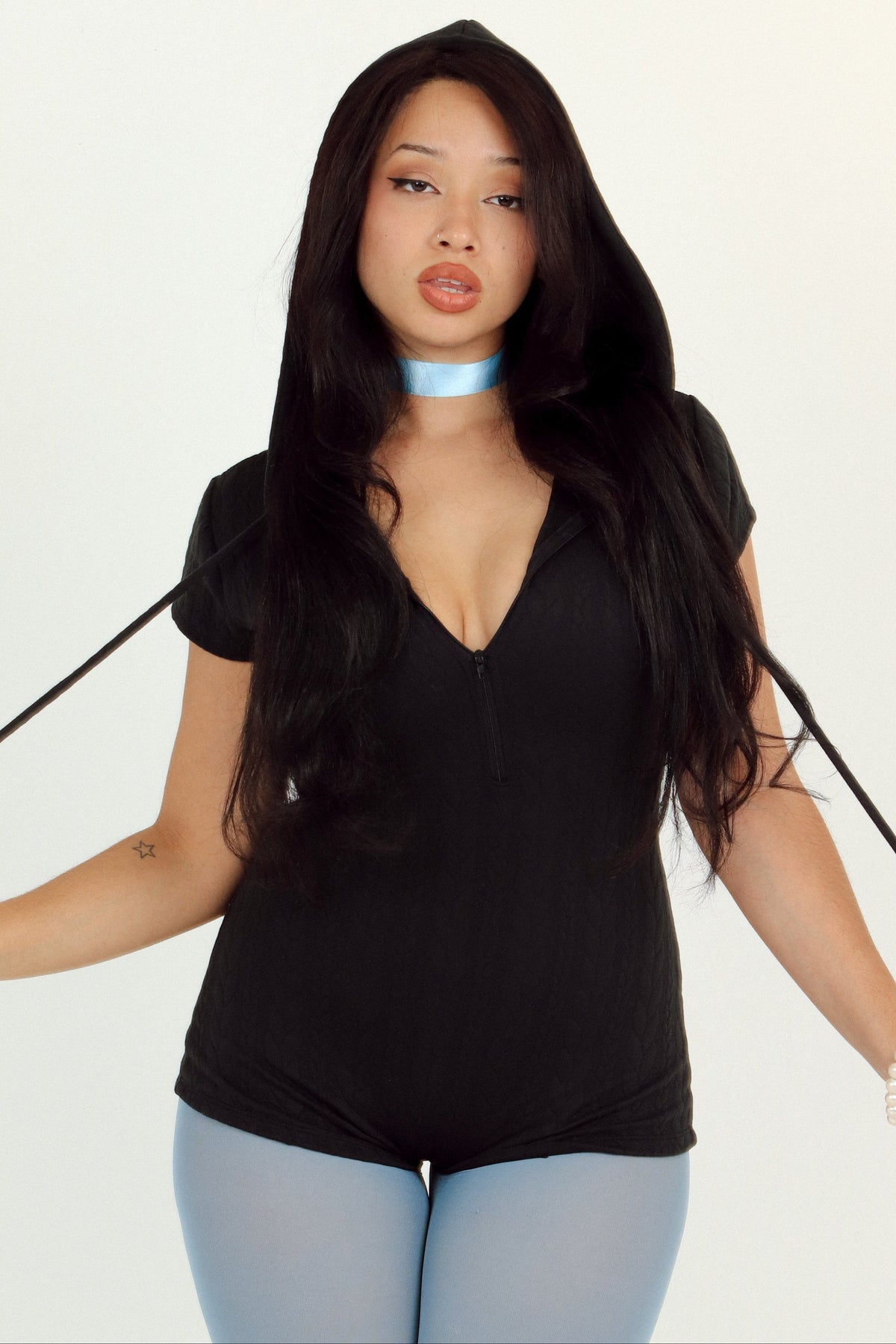 Bold, sleek, and effortlessly commanding - The Ivy Romper is that confident one-piece you throw on and instantly feel powerful in. Featuring a fitted silhouette with a zipper front and an exaggerated hood, it's both functional and femme. Dress it up with heels or pair it with tights. This piece moves with you from day to night.
